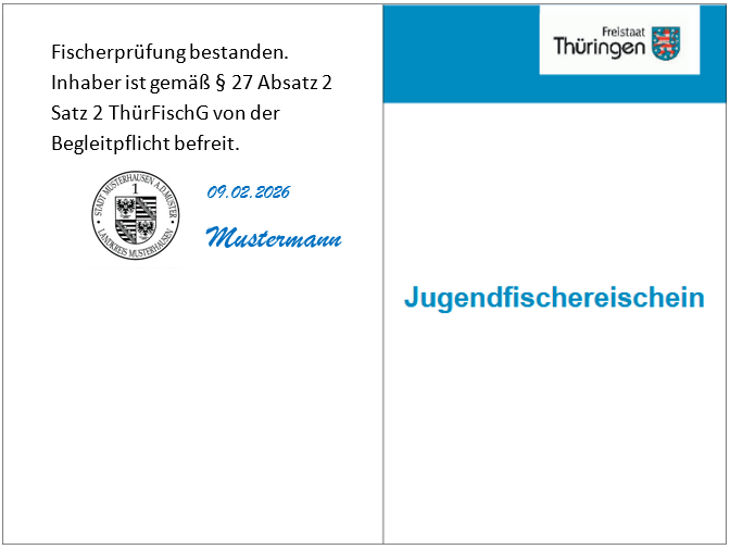 Im Falle einer bestandenen Fischerprüfung und der Erteilung eines Jugendfischereischeines, wird der Wortlaut: „Fischerprüfung bestanden. Inhaber ist gemäß § 27 Absatz 2 Satz 2 ThürFischG von der Begleitpflicht befreit.“ auf der leeren Rückseite des Jugendfischereischeines handschriftlich vermerkt und mit Stempel und Unterschrift der ausstellenden Behörde versehen (siehe Anlage).