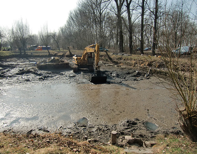 Nach Beendigung der Vorleistungen kam am 24.03.2012 der Bagger der Firma Wagner Straßen- und Tiefbau GmbH. Zur großen Überraschung aller wurde durch die Schaulustigen eine Atmosphäre mit Dorffestcharakter geschaffen. So waren Jung und Alt, Angler und nicht Angler auf den Beinen. Während der Baggerarbeiten wurde die Gewässerprofilierung mit Flach- und Tiefwasserzone neu gestaltet. Im Flachwasserbereich wurden ca. 20 cm bis 30 cm Schlamm abgetragen in der Tiefwasserzone 2,0 m bis 2,5 m. Das entspricht mehr als 1.000 m2 Schlamm. Anhand dieser Zahlen kann man die Notwendigkeit der Gewässersanierung sehen. Nach Beendigung der Baggerarbeiten haben die Fein-Arbeiten der Gewässergestaltung begonnen. So wurden auf der Insel Sumpfschwertlilien und eine Trauerweide gepflanzt. Im Bereich des Ufers wurden mit Schaufel und Spaten noch die Angleichungsarbeiten durchgeführt und Rasen gesät.